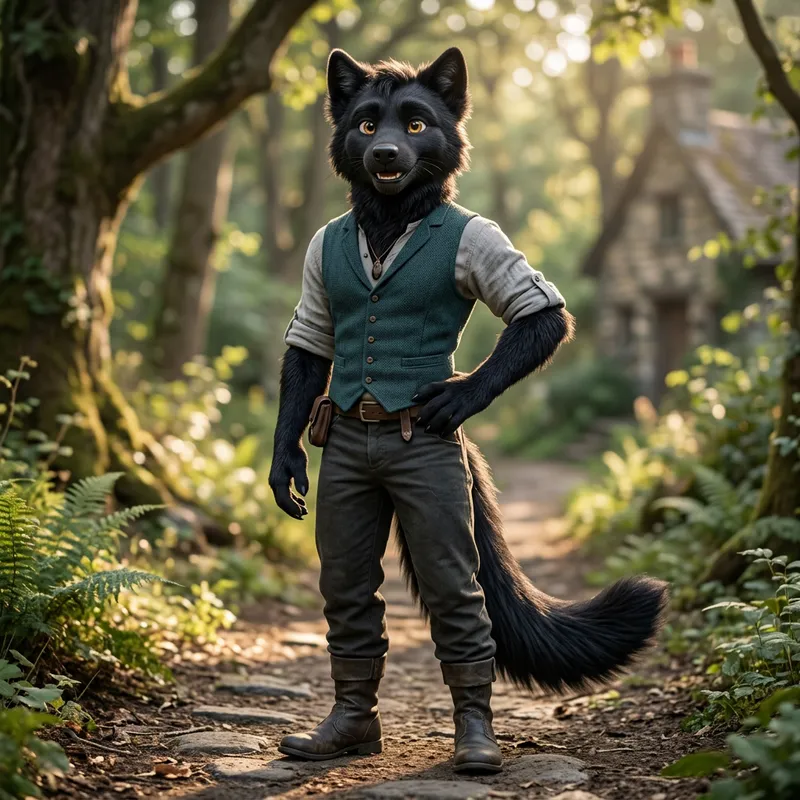 A character design of a black furry character. The character should be humanoid with soft, black fur covering its body. It should have bright, animated eyes and a warm, friendly smile. Its posture should be relaxed, with one hand casually resting on its hip. The overall style should be imaginative yet realistic, with careful attention paid to detail such as the shine in the fur, the play of light and shadow, and the expressive nature of the character's face.