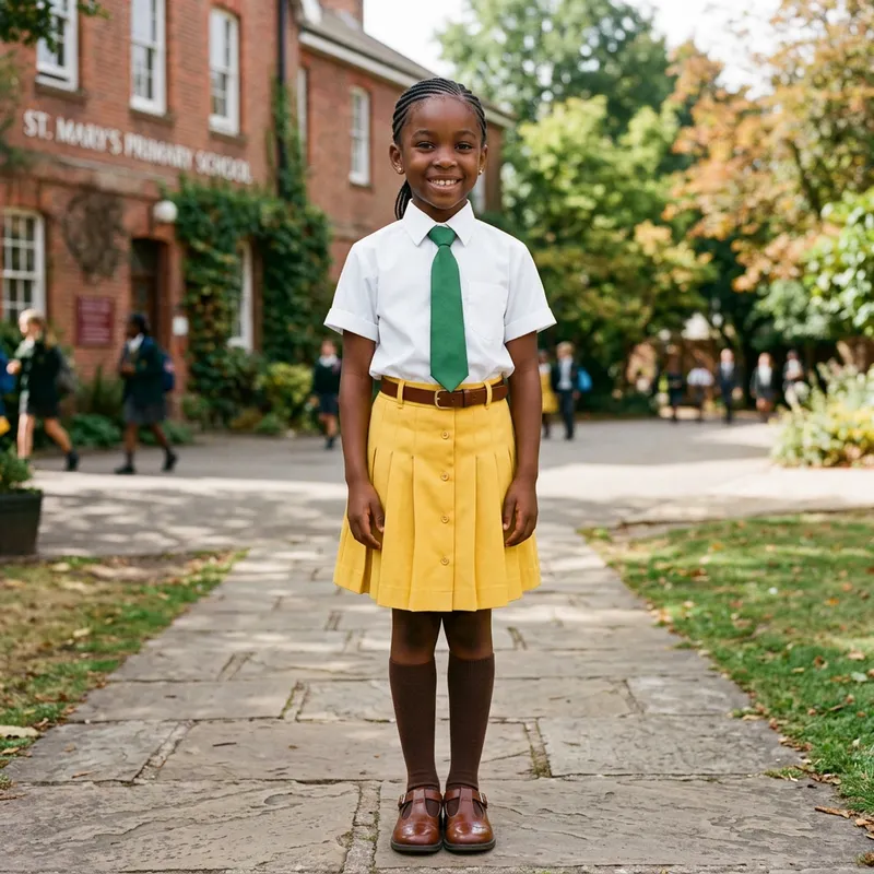 Black girl with cornrow hairstyle in a white button front shirt and green tie, shirt tucked in a yellow button front pleated skirt. Wearing brown socks with brown shoes.