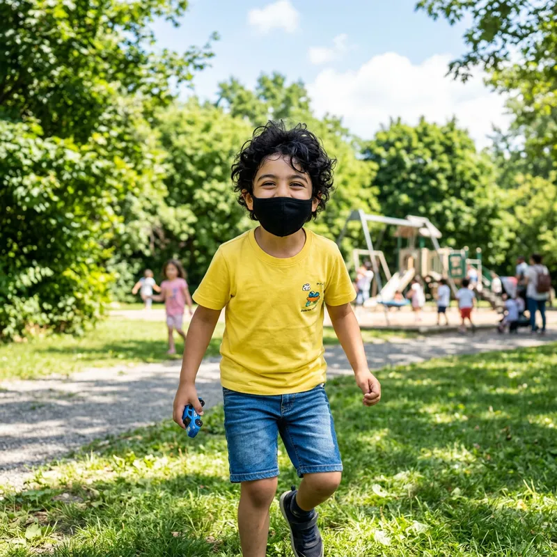 A young boy of Middle-Eastern descent wearing a black mask, outdoors amidst a sunny, cheerful scene. He has jet black hair and his eyes, filled with mischief and joy, are twinkling above the mask. He's dressed in casual, comfortable clothing suitable for a day of play; a yellow t-shirt and denim shorts. A green park is visible in the background with lush trees and children playing in the distance.