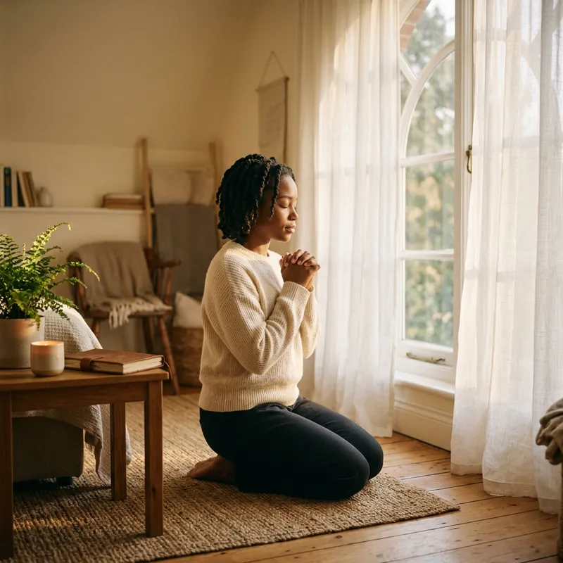 Black model in a serene room, kneeling in prayer before a large window, in the style of soft morning light filtering through sheer curtains, conveying deep reflection and hope, captured with a Canon EOS R5, focusing on warm tones, intimate atmosphere, inspirational portrait.