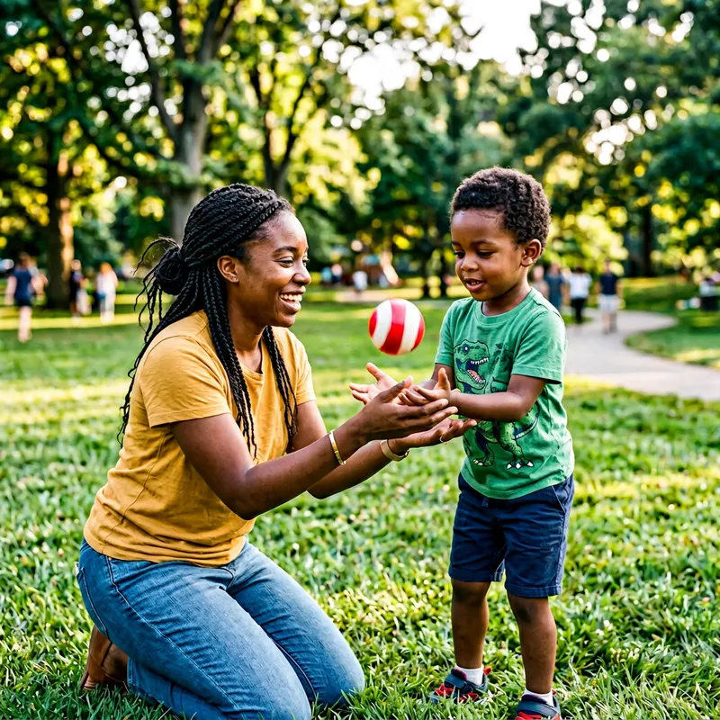 A young Black mother is seen in the soft light of the late afternoon sun. She is joyfully engaged with her 5-year-old son, teaching him how to catch a ball. The background is filled with lush, green grass of a local park. Her fingers gently guide his small hands positioned to catch a ball in mid-air. Both of them are wearing casual, comfortable clothes that make the setting even more relaxed and congenial. Their faces are filled with focus, displaying a touching scene of mother-son bonding over a simple game of catch.
