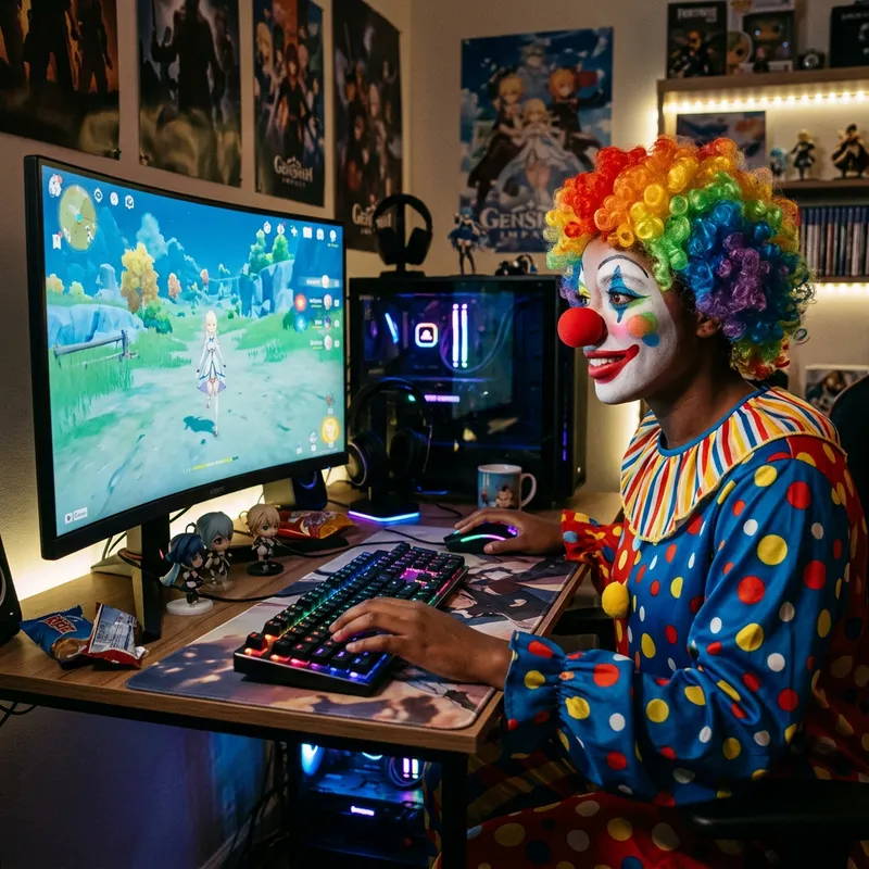 black person as a clown playing genshin impact on a PC using mouse and keyboard