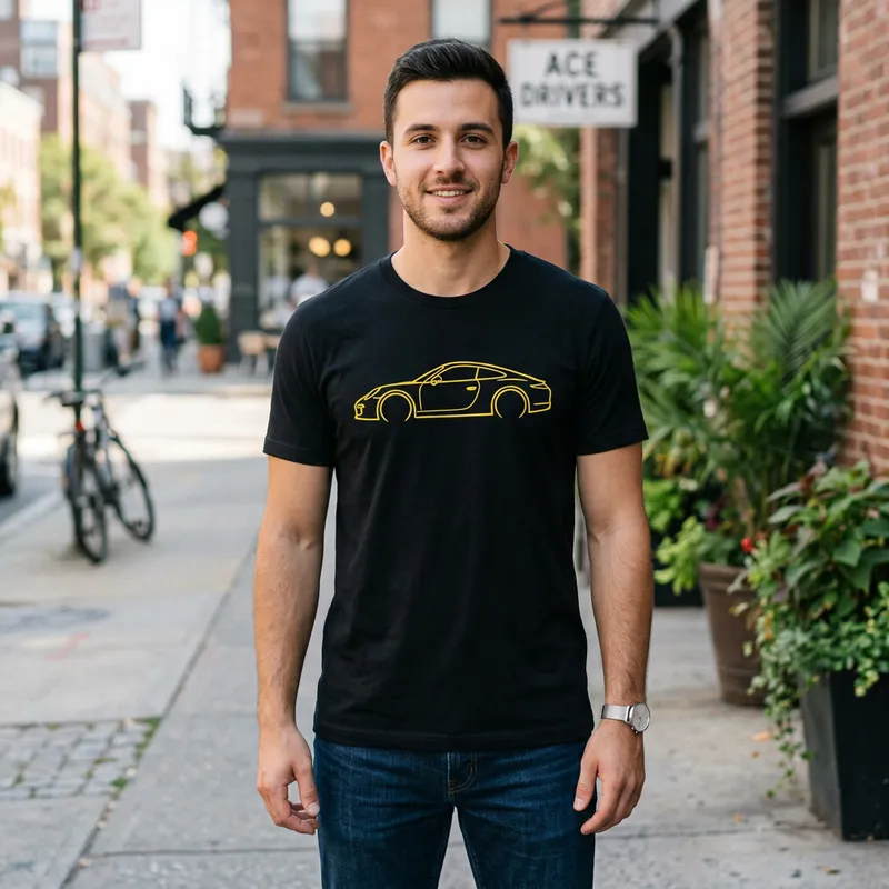 Black T-shirt with a sleek yellow sports car silhouette on the front, minimalist style
