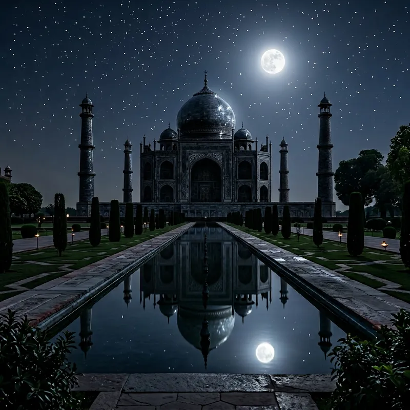 Imagine a variation of the iconic Taj Mahal, a mesmerizing symbol of India's rich history, but instead of its signature white marble, it's made of a deep, glossy black stone. The moon shines brightly in the clear night sky, casting a silvery light over the magnificent structure. Its domed central tomb is particularly striking, glimmering under the moonlight. Tranquil lush gardens surround this architectural masterpiece. The reflective pool in front of the main mausoleum mirrors the black Taj, making the whole scene doubly beautiful.
