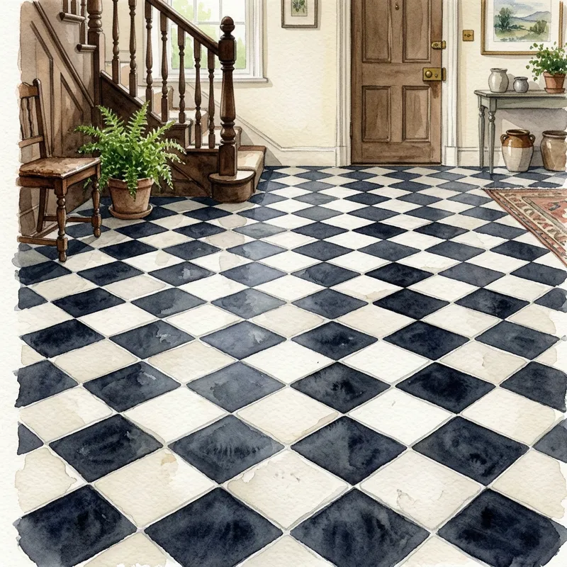 Create a watercolor painting of a floor patterned with black and white rhombus shapes laid out in a chessboard style.