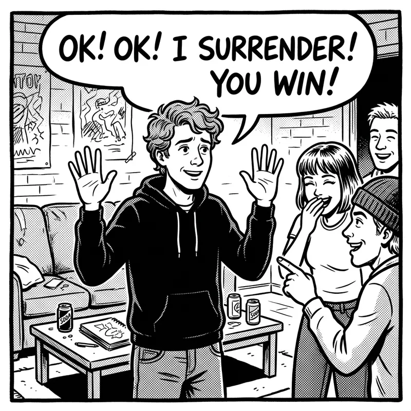 Black and white comic-style illustration of a Caucasian individual raising their hands in front of their friends, signaling: OK, I surrender