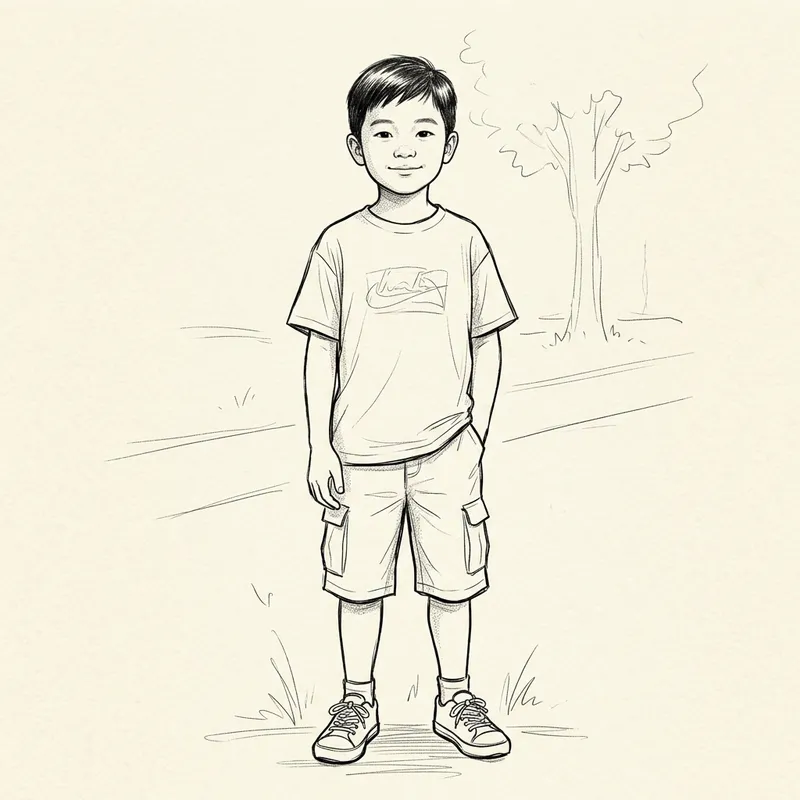 Aged 8 Asian Boy: Casual Black and White Sketch