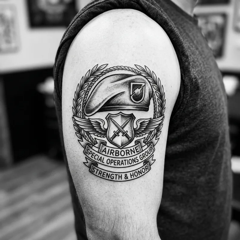 A black and white tattoo of the logo of what can be identified as a military organization, including a red beret
