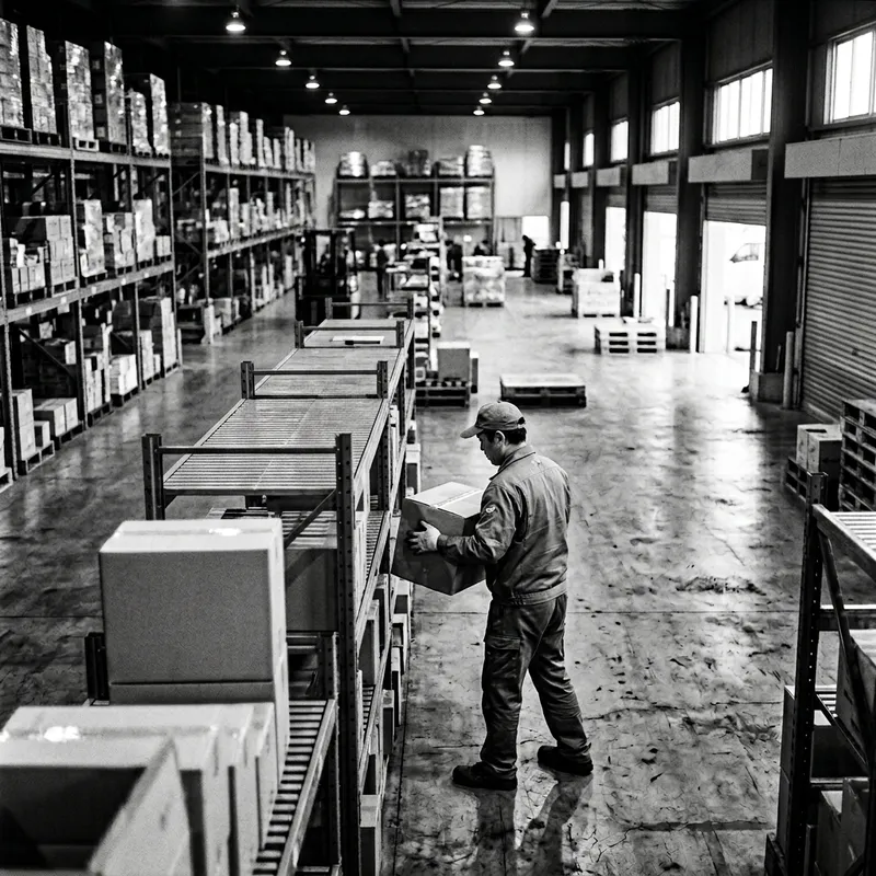 Generate an image in black and white showing a landscape view of a warehouse. In the scene, an Asian male worker, seen from his back, is holding a box. He is dedicatedly performing his duties, encapsulating the hardworking spirit of warehouse employees.