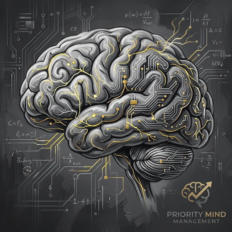 Create a grayscale image featuring a brain with its intricate neurons, painted in hues of black, yellow, and gold. The design should also incorporate electric circuitry elements, symbolizing the complex interconnections within the mind. In addition, include a logo that denotes 'Priority Mind Management'. The logo should be subtle yet distinct, blending seamlessly into the overall composition.