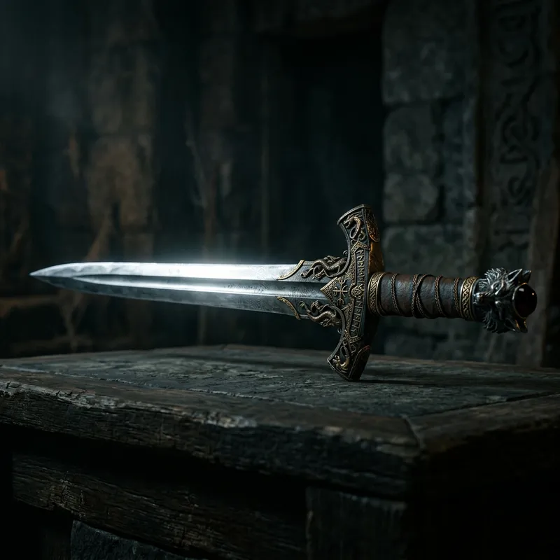A highly detailed image of a blade weapon. The weapon is set against a mysteriously dark background that contrasts with the gleaming sharp edge of the steel. Its hilt is exquisitely designed with intricate patterns and motifs, suggesting an ancient origin. The blade itself is long and slender, catching the minimal light in the surrounding environment and reflecting it brilliantly. The overall aura of the weapon suggests an intimidating presence and a rich history woven into its formidable construction.