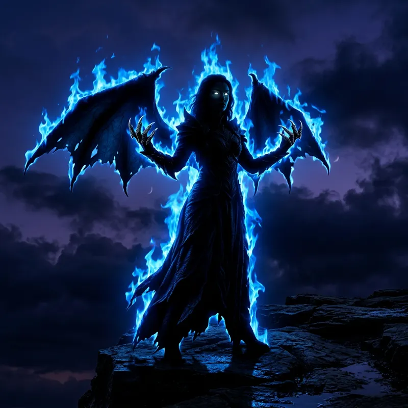 The silhouette of a woman, who is also a dragon-witch, is blazing with a blue flame that gives her a distinct and powerful aura. Her strength and predatory nature are visible in her sharp metal claws and wings. Her gaze is enigmatic, evoking a sense of mystery and intrigue, as if beckoning to far-off worlds. Amidst the blue blaze, every aspect of her asserts a definitive blend of supernatural power and feminine strength.