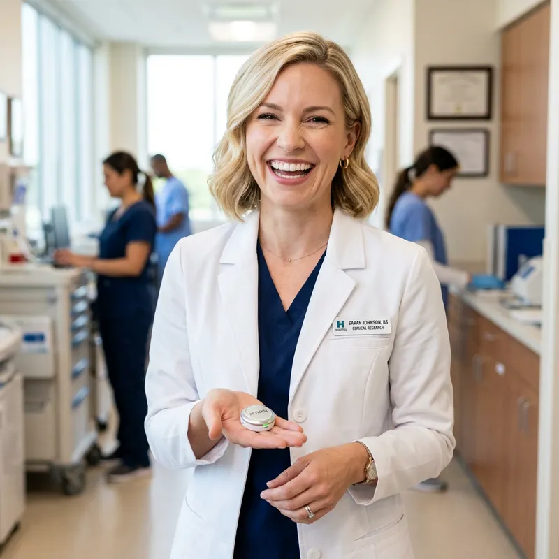 A cheerfully smiling, blonde Caucasian woman donning a short white medical gown and holding a button in her palm. Her hair is styled elegantly and the gown fits her form neatly. She radiates positivity and the atmosphere is filled with her infectious joy. The button she holds seems to be of some significance. It's probably part of some sort of medical apparatus.
