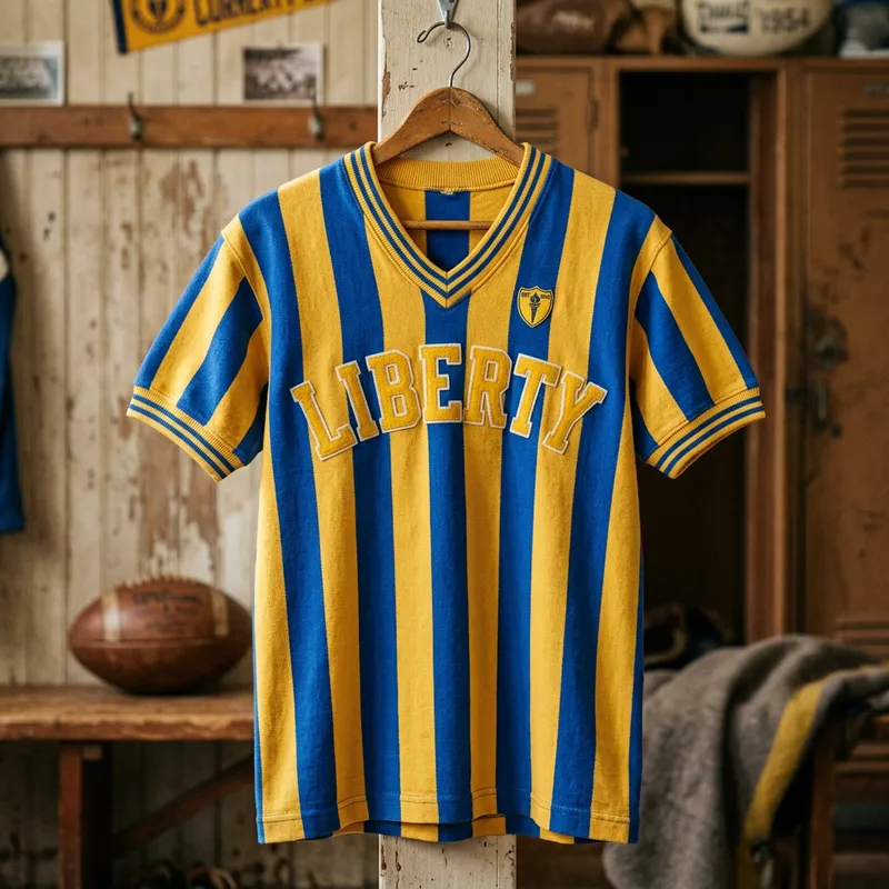 A 1950s style soccer jersey in blue with yellow stripes, and the word 'Liberty' displayed in its center.