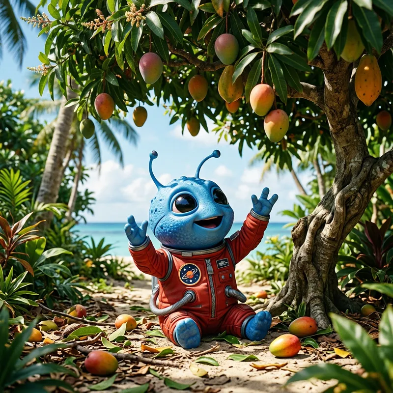 Generate a detailed image of a small, blue alien with large black eyes, a wide mouth and two arms reaching out. It has two flimsy antennae on its head, its body resembles a blue basketball and it sits on short, stumpy legs. The alien is adorned in a red spacesuit with a patch displaying an abstract symbol. The alien is under a fruit tree, gazing up at the lush canopy, surrounded by fallen fruit, and the setting is a tropical island.