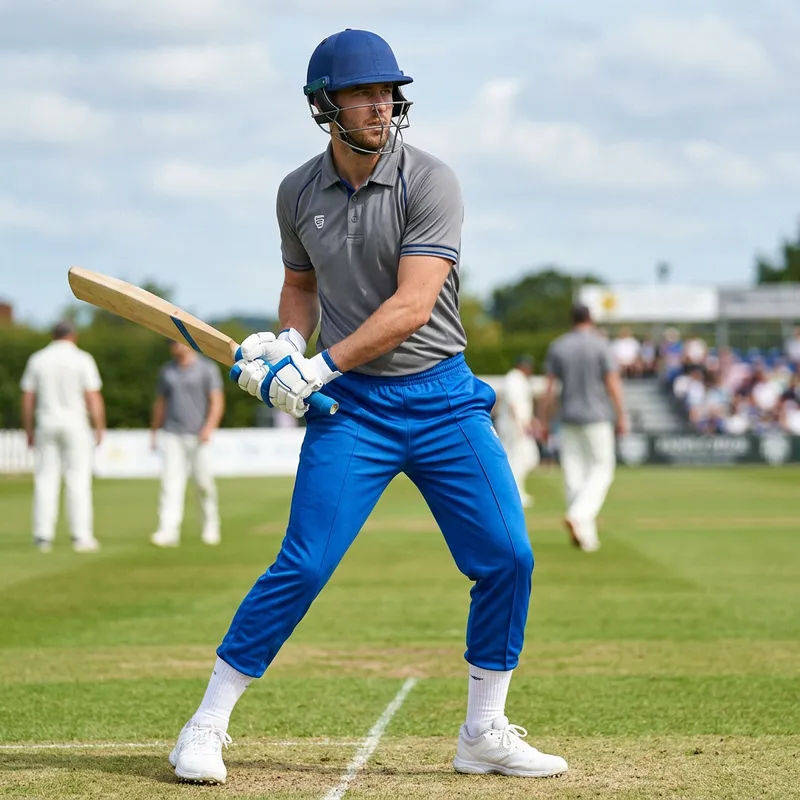 Visualize a cricket playing attire, featuring a blue pair of trousers and a grey shirt. The trousers should be well-fitted for agile movements, tailored specifically for sportspersons. They should be a vivid and uniform blue color. Likewise, the shirt should be designed for comfort and flexibility. The shirt's color should be a solid grey. The kit might also include protective gear, such as gloves and a helmet, but these are optional. Try to evoke the style and spirit of a traditional cricket uniform.