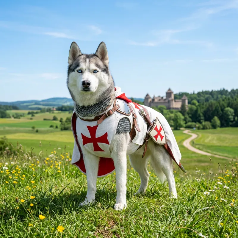 Blue-Eyed Siberian Husky in Templar Knights Uniform