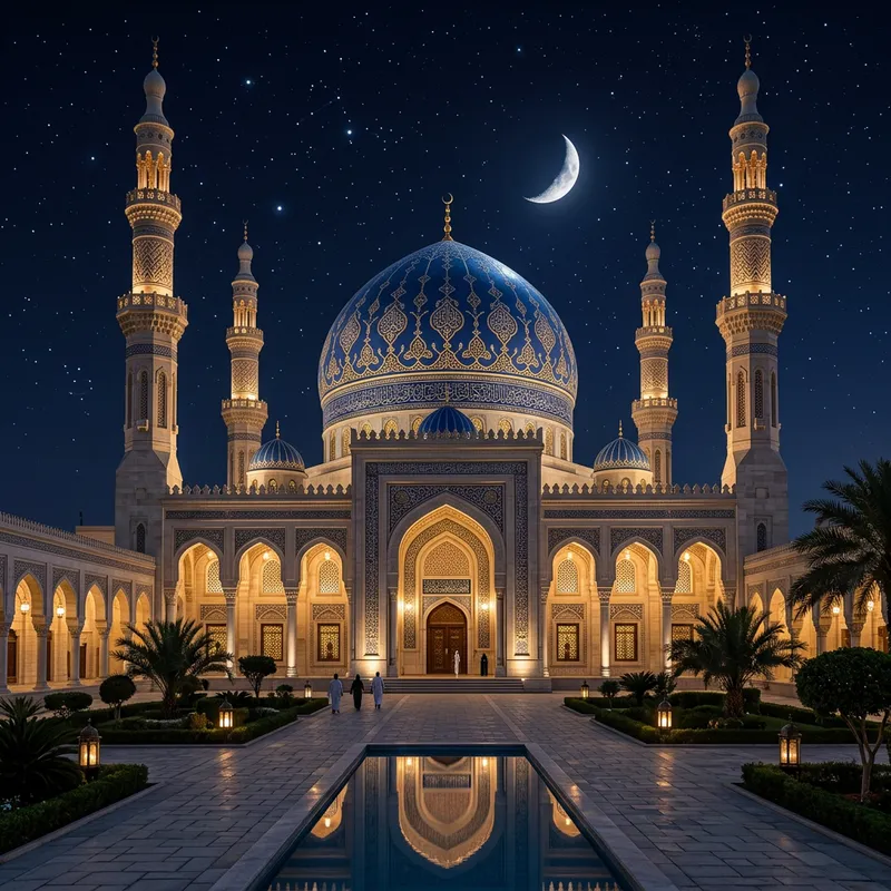A high-definition image of a beautiful Mosque against a night sky. The Mosque has a spectacular dome that is painted in deep, night blue color, reflecting the moonlight and stars. The architecture of the building is intricate, demonstrating the attention to detail that goes into such a magnificent structure. It stands as a peaceful beacon, its majestic silhouette outlined against the dark sky.
