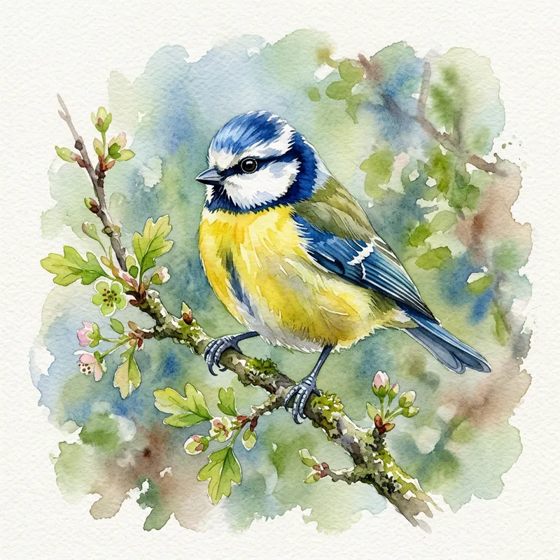 A blue tit bird illustrated in watercolor style.