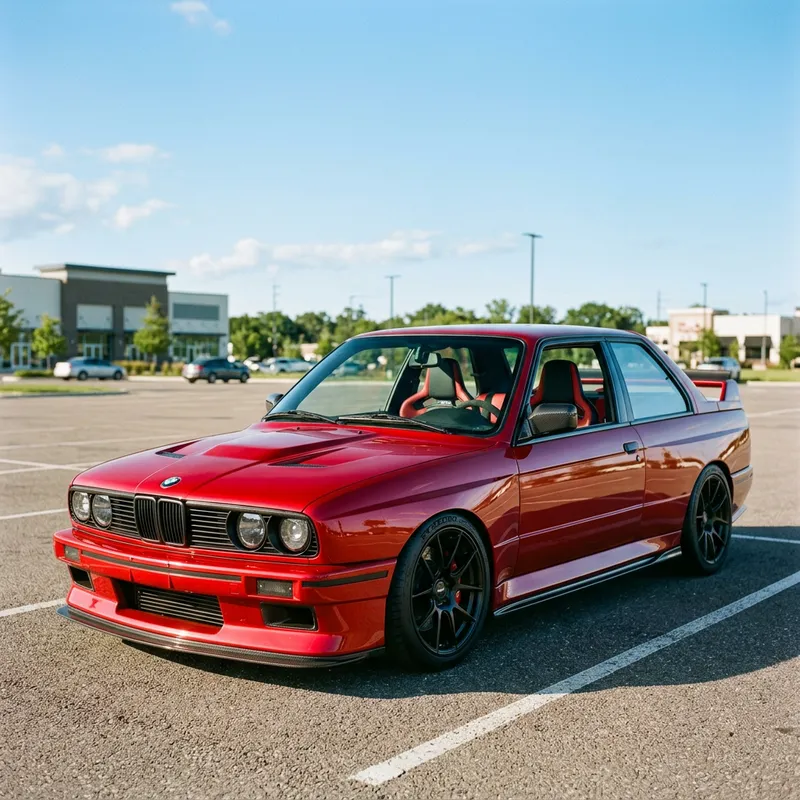 A stylish and sleek sportscar renovation of the classic BMW brand. The car has a vibrant, glossy crimson paint coating that brilliantly reflects the sunlight falling upon it, accentuating its streamlined curves and sharp edges. The front of the car is low with grills defining its face, while its aerodynamic shape enhances speed and stability. The large alloy wheels with multi-spoke design complement the overall athletic look. Inside, the cockpit combines luxury and technology with leather seats, a futuristic dashboard, and a state-of-the-art entertainment system. It stands majestically in an open asphalt parking area with clear, blue skies above.
