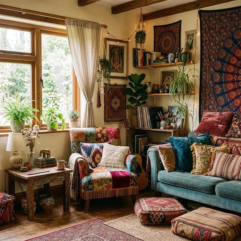 A composition embracing the spirit of bohemian art. A room filled with mismatched, vintage furniture. A retro-looking chair with patchwork upholstery sits in the corner beside a worn-out wooden table displaying curios and knick-knacks. Plush cushions are scattered around the room. On the walls are tapestries with intricate and ornate designs, reminiscent of an era long past. A large window lets in ample natural light, highlighting the unique and rugged beauty of boho-style interior. The scene elicits feelings of freedom, non-conformity, and an appreciation for nature, imparting a relaxed yet vibrant aesthetic.