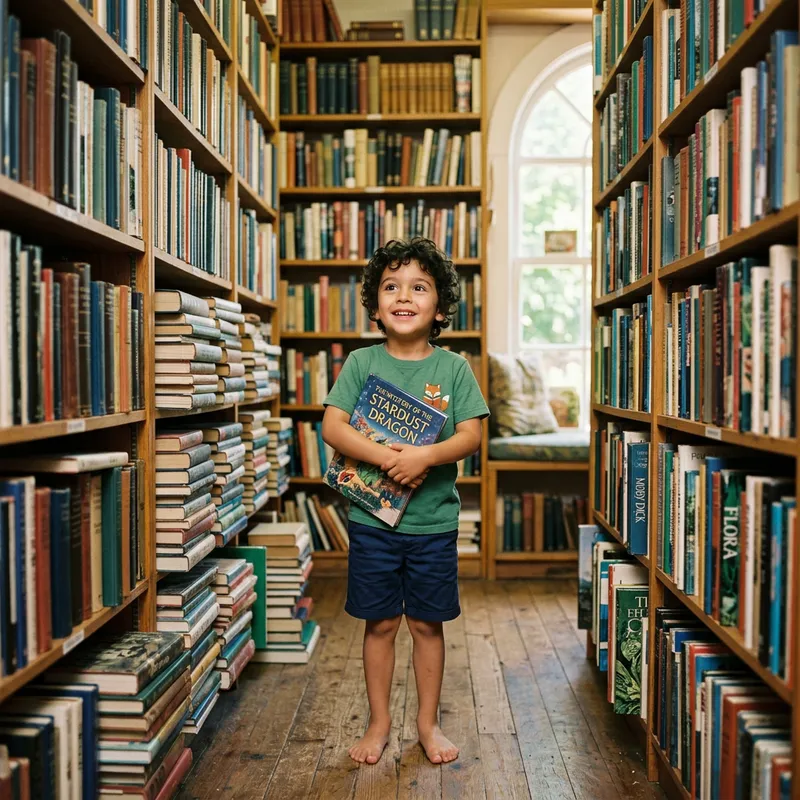A young Hispanic boy stands in awe, surrounded by towering stacks of books to his left and right. His wide eyes sparkle with excitement and curiosity, and his small hands clutch a large hardcover book. He's wearing a green T-shirt and navy shorts. The books vary greatly in size, color, and thickness, hinting at an array of stories and knowledge within them. The scene bathes in warm, inviting light from a nearby window, further highlighting the magical sense of discovery and the love for reading.