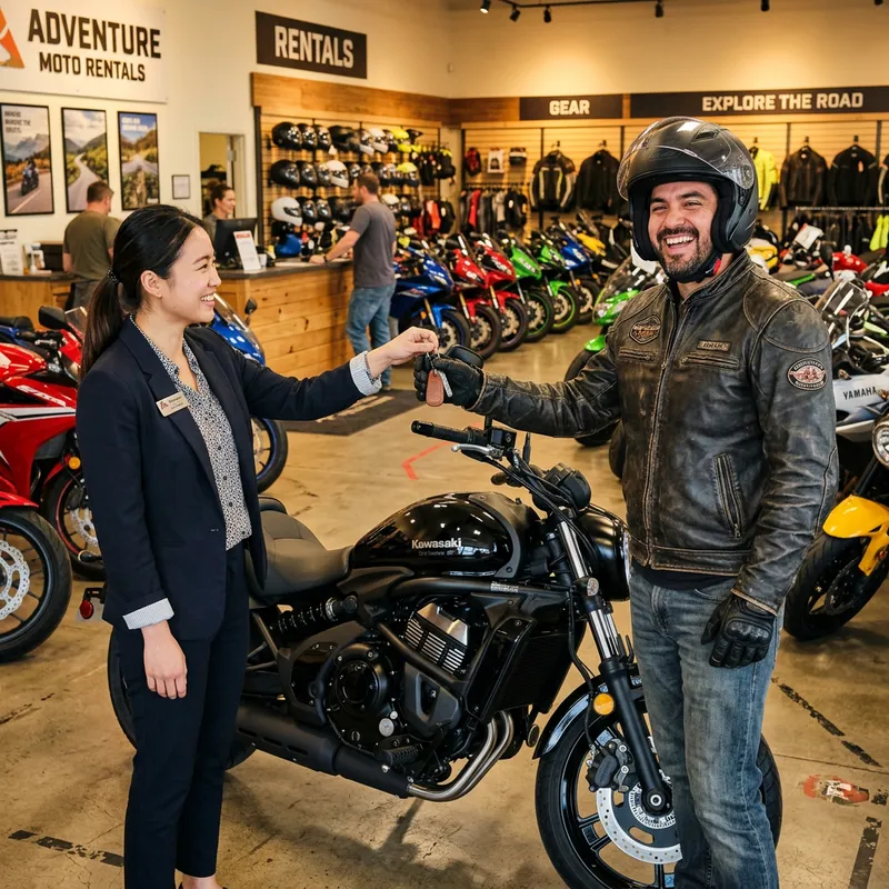 A scene at a motorbike rental store. In the foreground center, there's a black sleek motorbike that looks shiny and new. On the left, an Asian female employee in business casual attire is handing over the keys to the motorcycle to a joyful Hispanic male customer, who is wearing a protective helmet and leather jacket, ready to hit the road. Behind them, there is a row of various models and colors of motorbikes. The store is beautifully lit, creating a warm and welcoming atmosphere.