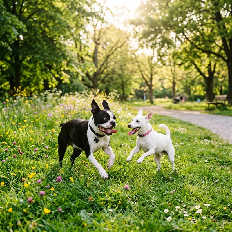 A Boston Terrier dog playing with a white Miniature Pinscher dog in a grassy park. They have happy expressions on their faces and their tongues are hanging out as they frolic about. The spring sun above is shining warmly, with a soft afternoon glare illuminating the scene. Trees with green, lush leaves surround the area, and flowers of multiple colors sprinkle the park landscape. The Boston Terrier is a little bigger, with a shiny black and white coat, while the Miniature Pinscher is smaller and has a dazzling white fur that contrasts against the vivid green of the grass.