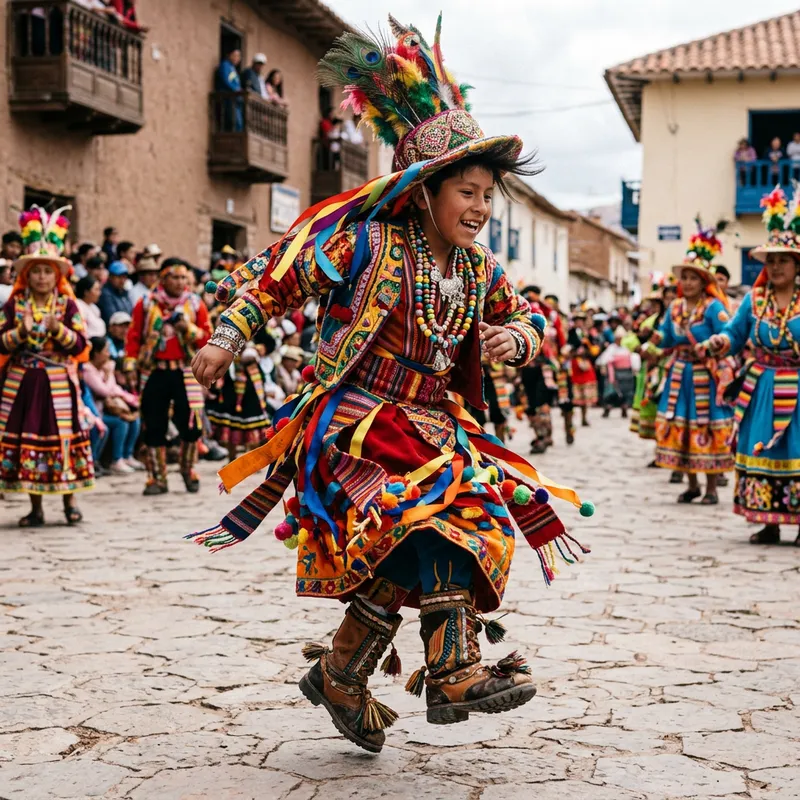 A boy performing the traditional Tinkus dance. His attire is vibrant and colorful, featuring multiple layers of flowing fabric in hues of red, blue, and yellow. His movements are rhythmic and well-coordinated, evoking feelings of joyful celebration. He wears heavy, decorative footwear which clicks rhythmically on the floor as he dances. Various accessories like necklaces and headgear with feather accents complete his ensemble, adding to the vivid colors already present in his attire. The atmosphere of the image should emanate infectious enthusiasm, reminiscent of the energetic spirit of the Tinkus dance itself.