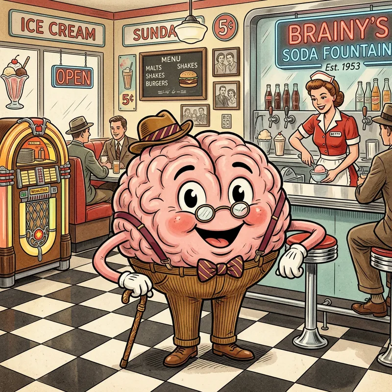 Create an image of a brain depicted as a vintage mascot character. The brain should be anthropomorphized and situated in a nostalgic, retro setting. The mascot could have flexible limbs, big friendly eyes, and a mouth drawn with a jovial expression. It should be adorned with vintage accessories like a bow tie, suspenders, glasses, and a walking cane to emphasize its old-school charm. The background for this character could echo a mid-20th century, American diner or soda shop to enhance the retro theme of the image.