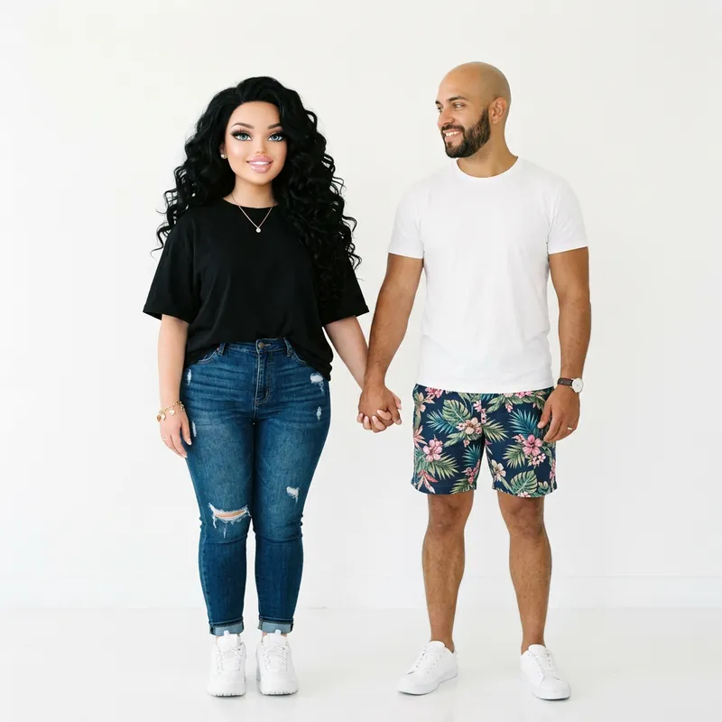 A highly detailed, realistic depiction of an adult Bratz-inspired doll-like figure. She is a curvy Caucasian woman with long, curled black hair and well-applied makeup. Her glossy lips are crystal clear and her eyes are a captivating shade of blue. She is adorned with a small rose gold chain and diamond stud earrings, along with a charming bracelet on her wrist. Her outfit consists of an oversized black t-shirt coupled with denim jeans. Beside her stands her loving partner, a Latino man with a neat beard and a bald head. His eyes are a green-brown mix and he is dressed in a white t-shirt paired with shorts showcasing a floral print. They are holding hands, signifying their strong bond, all presented against an all-white background.