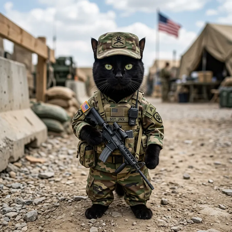 Imagine a feline in full combat gear. This brave cat, with a meticulously groomed coat of deep black fur and captivating green eyes, is dressed in a military uniform. The uniform is a blend of forest green and muted browns, providing excellent camouflage. It is complete with miniature-sized body armor and a tiny, insignia-decorated hat that firmly sits on its head. The feline soldier carries a small, harmless replica of a standard issue rifle. Despite its small stature, the cat stands tall and proud, ready to take on whatever lies ahead.