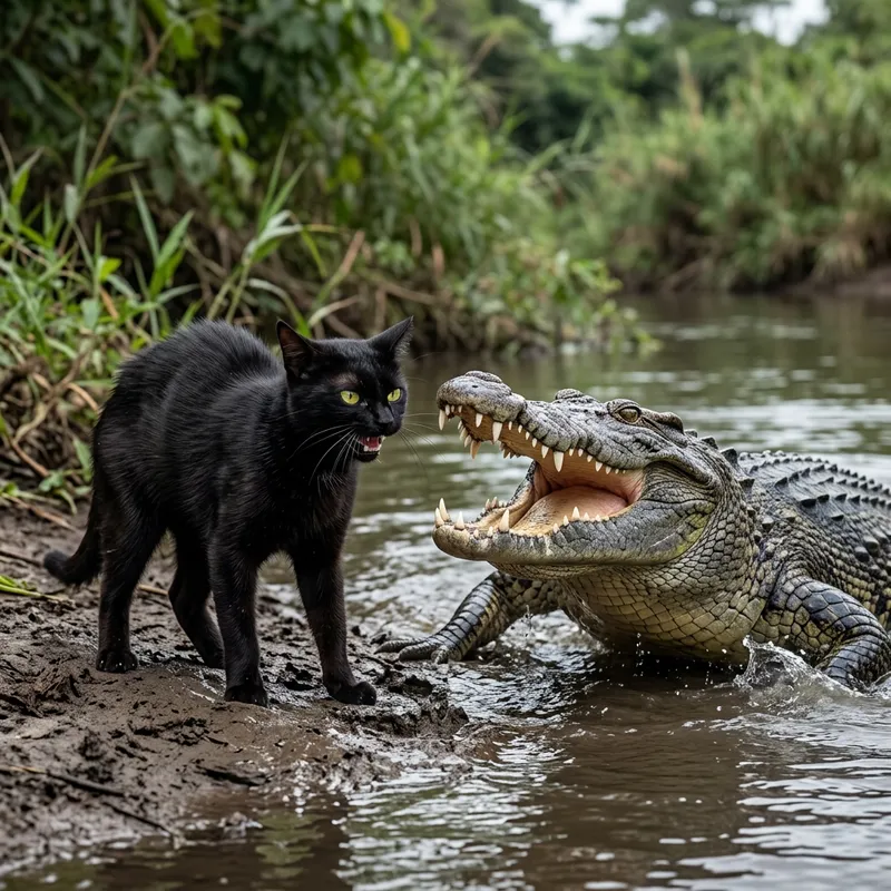 Brave Domestic Cat Shadow Faces Off Against Crocodile