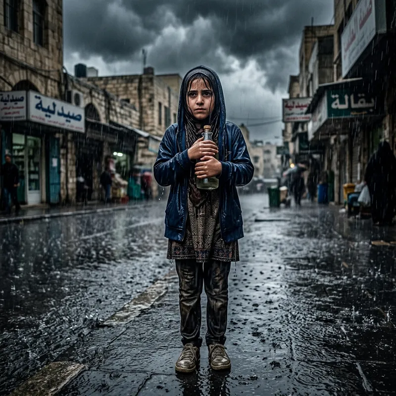 Visualize a scene where a Middle-Eastern girl is standing bravely in the midst of a heavy rain shower. She is carefully carrying a glass bottle, trying to shield it from the weather. Her hair is wet and glued to her face, while her clothes are soaking wet. The rain is splashing all around her, creating little puddles on the ground. The sky is dark grey, cloud-covered, and thunderous, effectively portraying the dramatic atmosphere of a serious downpour.