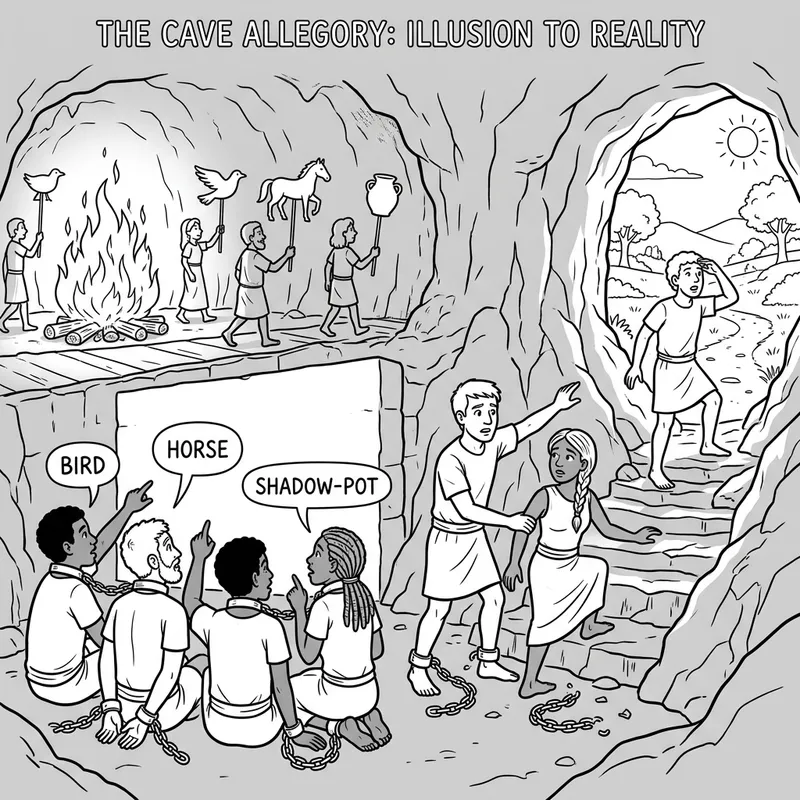 A black and white, simple and minimal coloring book page, displaying an intriguing scene. It shows a diverse group of people of various descents and genders, who have been living chained to the wall of a cave all their lives, facing a blank wall. They are mesmerized by the shadows projected on the wall from objects passing in front of a fire behind them. They give different names to these shadows. Meanwhile, a few individuals from this group have started breaking free and are seen leaving the darkness of the cave, gradually making their way to the open ground outside.