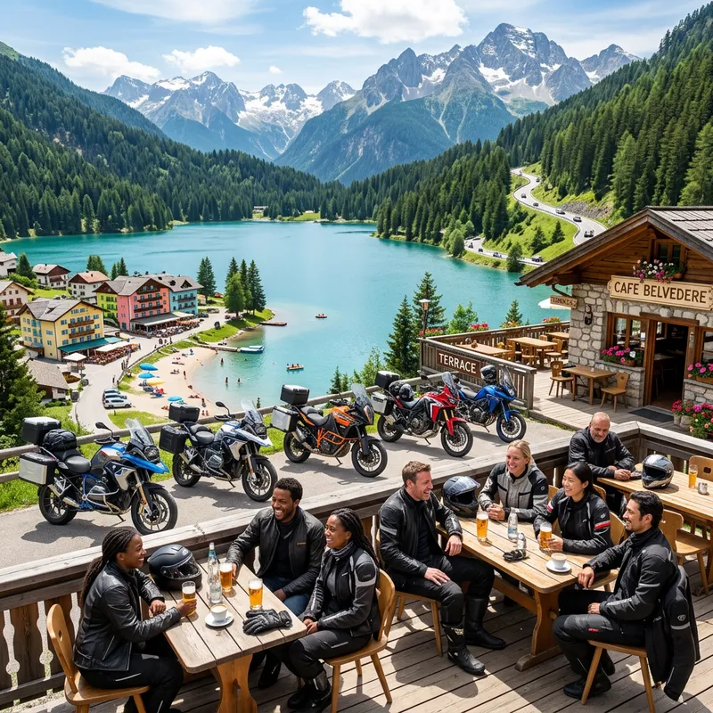 A beautiful scene in Europe on a splendid sunny day, featuring breathtaking mountain roads. A group of motorcycle riders, diverse in their gender and race, are relaxing at an outdoor bar. Their motorcycles are parked nearby. The backdrop is a rich green coniferous forest along with scenic mountain lakes. Around the lakes are cozy hotels and sandy beaches, making it an ideal holiday spot.