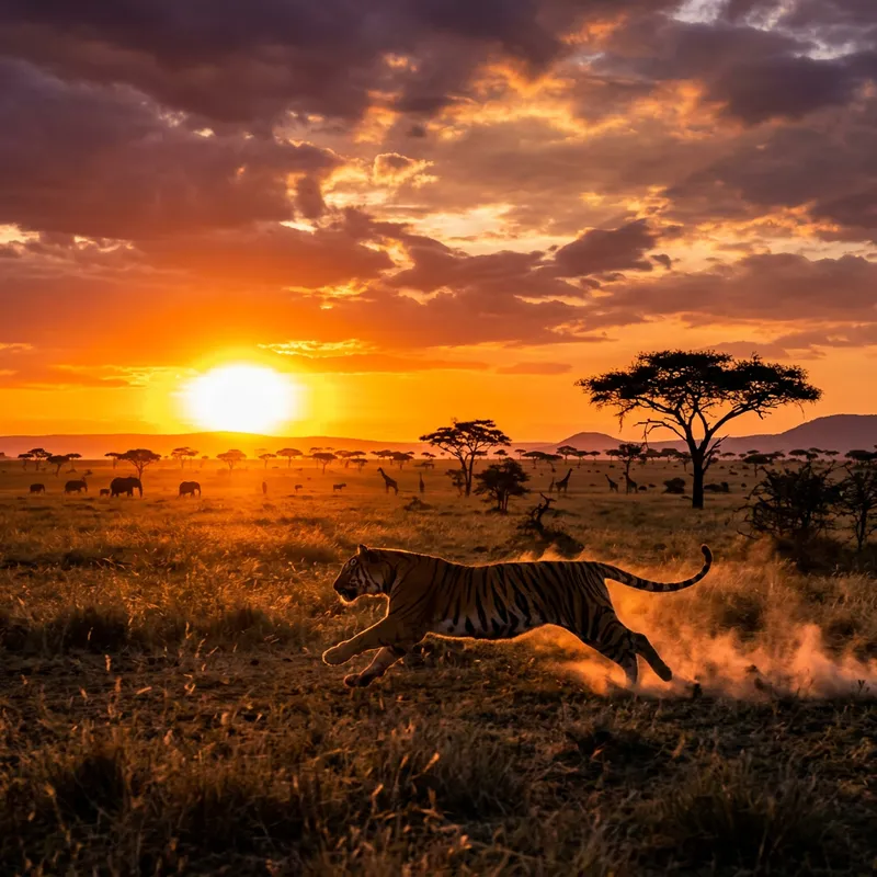 Generate an image of a breathtaking sunset over a savannah, encapsulating the raw power of nature. Picture vibrant warm tones, silhouettes, and a tiger in full sprint, enhancing the sense of its intensity, just as one might witness through a telephoto lens. Think of a National Geographic-style photo with a wide-angle shot, deeply inspired by wildlife.