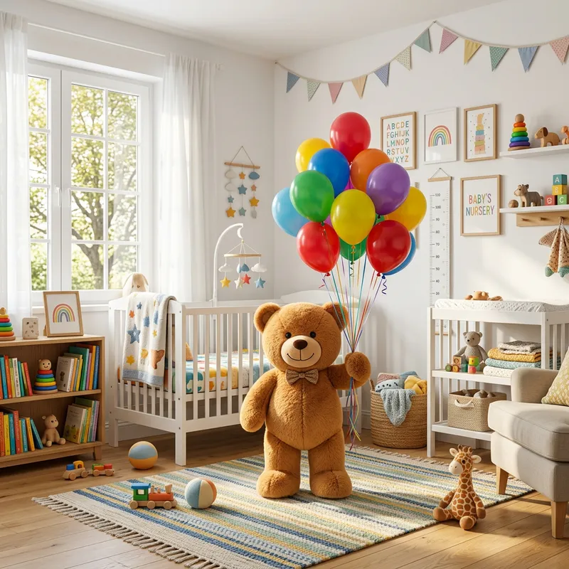 Bright and Colorful Nursery Room with Plush Teddy Bear and Vibrant Balloons
