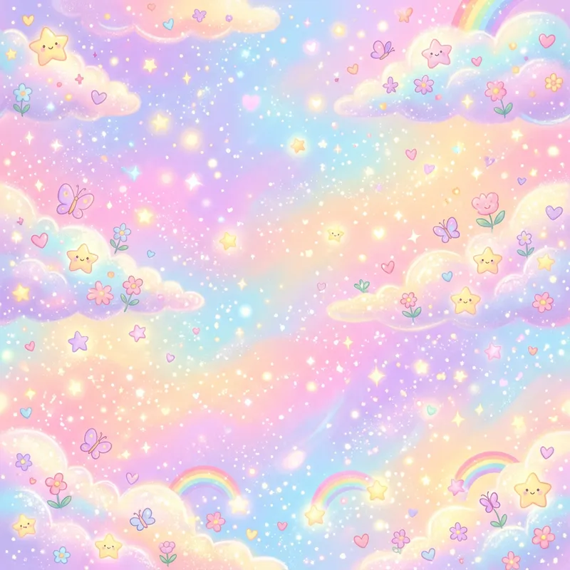 Create an illustration of a bright and cute background. The backdrop should be filled with shimmering pastel colors, exhibiting an aesthetic that is both charming and cheerful. The arrangement of the colors should create a soothing effect, whereas the brightness should give it an energetic vibe. Overall, the scene should portray an ambiance of warmth, welcoming, and joy.
