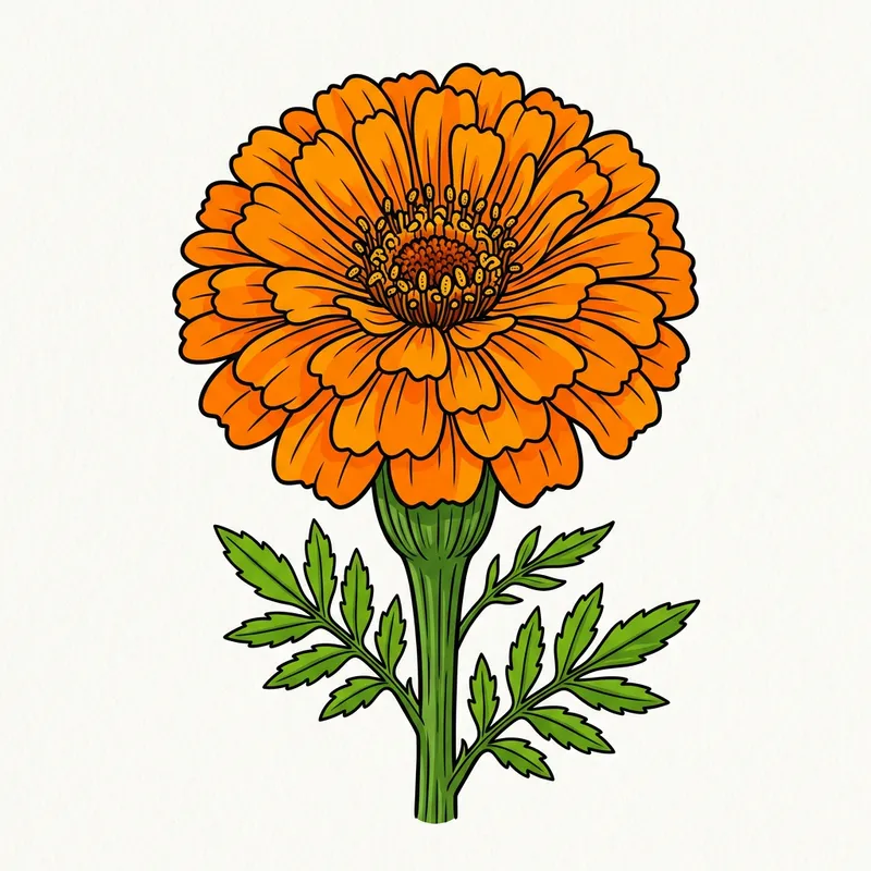 Illustration of a bright orange marigold flower, with petals radiating outwards in a beautiful burst. The center should be darkened, and filled with the details of stigma and stamen. The flower blooms atop a green, fluted stem, with a few leaves sprouting laterally. Complete the image with distinctive outlines and flat colors to embody the charm of a clipart.