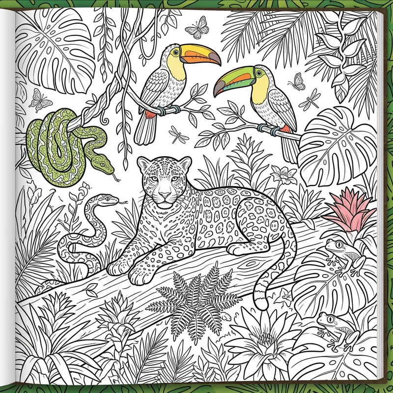 Brightly colored toucans, frogs, jaguars, and snakes among vibrant plants. for coloring book