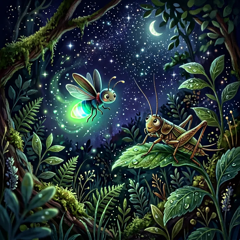 Ilustración de una luciérnaga brillante de color verde y azul reflexionando una luz tenue, volando a través de la oscuridad de la noche, cerca de un grillo de color marrón y verde sosteniéndose en una hoja. Cada uno de ellos tiene expresiones faciales curiosas y detalladas, y su ambiente circundante está lleno de vegetación nocturna y estrellas parpadeantes en el cielo.