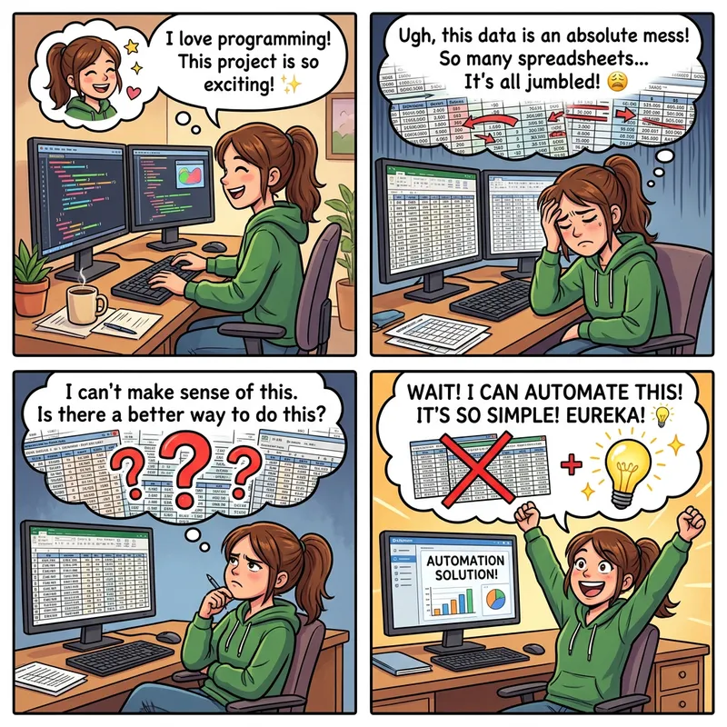 Create a four-panel comic. In panel one, depict a Caucasian, brown-haired girl seated at a computer, with expressions of joy and engagement, symbolizing her enjoyment of her work. For panel two, show the same girl with a sad expression, and the thought bubble overhead revealing her mental image of complicated electronic tables. In panel three, illustrate the girl in a state of contemplation, with a thought bubble showing spreadsheets with a large question mark over them. Lastly, for panel four, portray the girl extremely jubilant, with a thought bubble showing the image of crossed-out spreadsheets and a lightbulb symbolizing a brilliant idea.