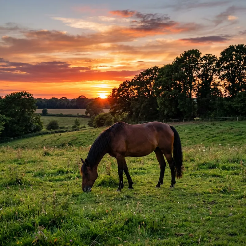 A horse in a grassy field during sunset. The horse is brown with a black mane and tail. It is seen grazing peacefully on the fresh green grass. Behind it, the setting sun paints the sky in brilliant shades of orange and red. In the distance, there are silhouettes of tall trees standing against this vibrant backdrop.