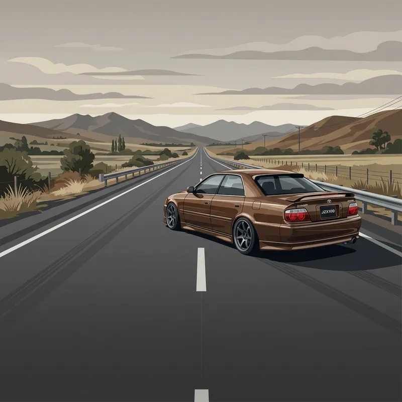A digital art piece measuring 1920 by 720 pixels. It features a brown Toyota Chaser JZX100 standing on a road, illustrated in a vector style. The car's sleek design and the road's straight path are the main elements of the composition. The color palette is dominated by tones of brown and grey, with the brown of the car standing out boldly against the muted colors of the road.