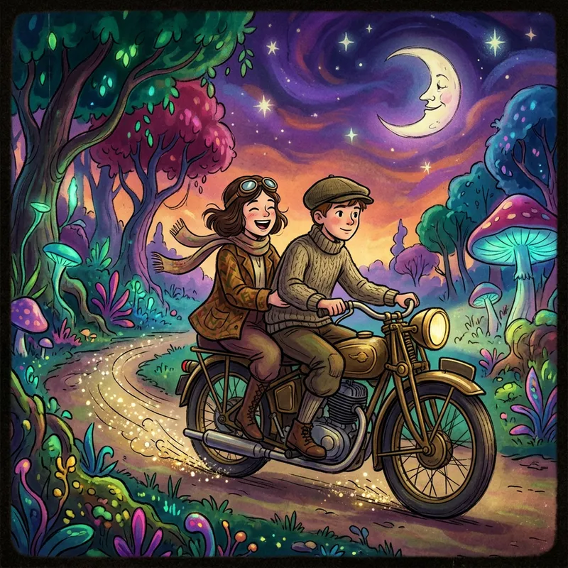 Brunette Girl and Boy in a Magical Motorcycle Journey