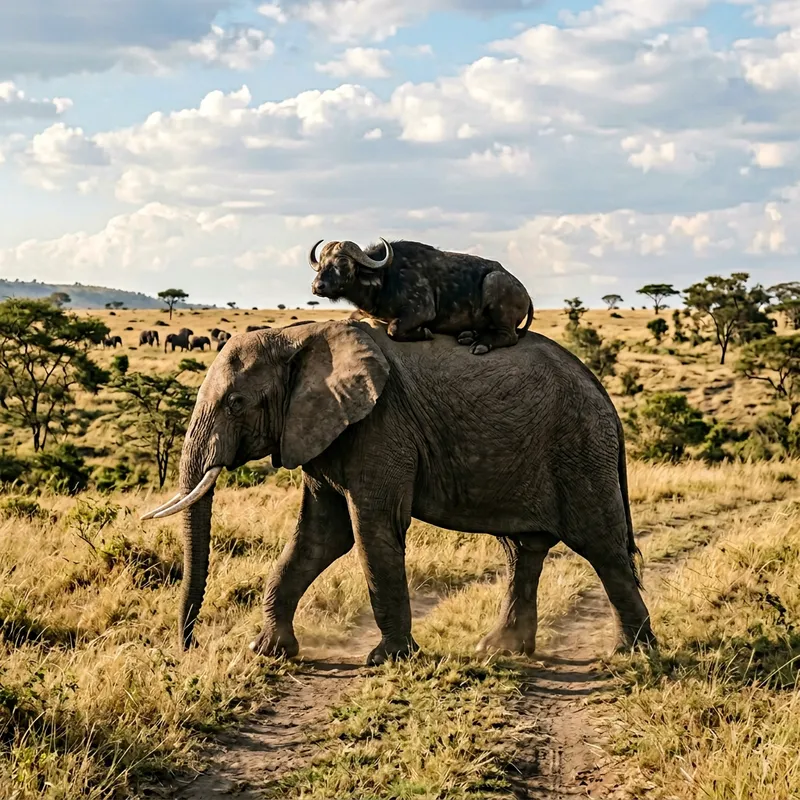 Buffalo Riding on Elephant in Serene Natural Landscape