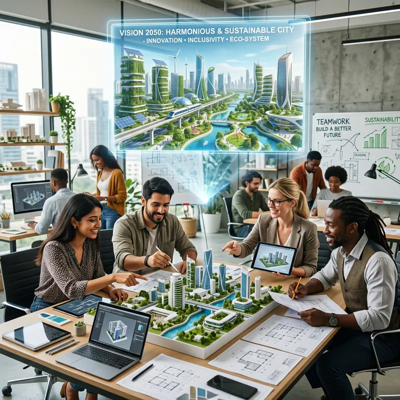 Imagine an image showing various people of different descents and genders working together harmoniously on designing a futuristic city. Picture South Asian women, Hispanic men, Caucasian women, and Black men all actively participating. They could be brainstorming, drawing up architectural blueprints, constructing miniature models, programming futuristic technologies, and planting green spaces. Visualize a scene of unity, collaboration, and shared vision. Above them, there's a large holographic screen that displays their collective vision: a city that combines smart technologies, sustainable practices, and inclusive spaces. This is about teamwork building a better future.
