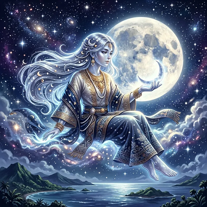A digital illustration of Bulan, the god of the moon in Philippine mythology. Bulan is portrayed as a youthful, ethereal being with a gender-neutral appearance, dressed in traditional Filipino attire. Their luminescent skin glows with a silver sheen, echoing the soft radiance of the celestial body they embody. Their hair is long and appears to be made of moonbeams, draping elegantly down their form. They hold a crescent moon in their delicate hand, a symbol of their dominion. The backdrop is a serene night sky, glowing with stars and a larger full moon that Bulan gazes pensively at.