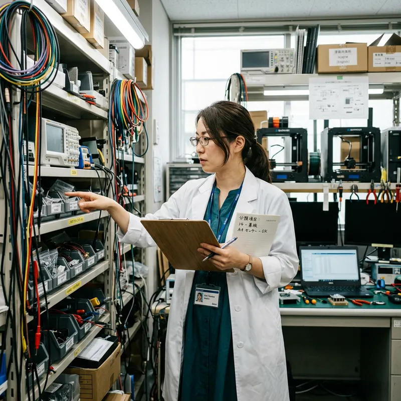 An intelligent, brunette female scientist in a teal coloured dress holding a clipboard. She is busy categorizing items in a workshop-like background cluttered with high-tech equipments, cables, and array of tools. She exhibits a strong aura of determination and focus. She is Japanese in descent.